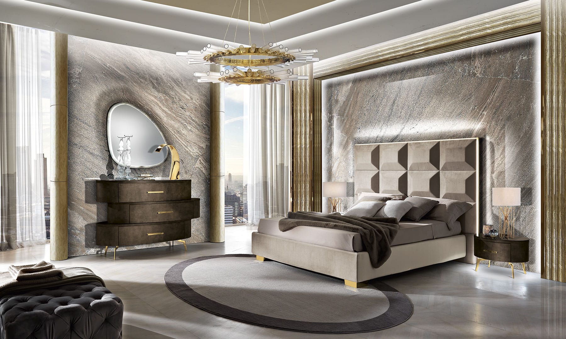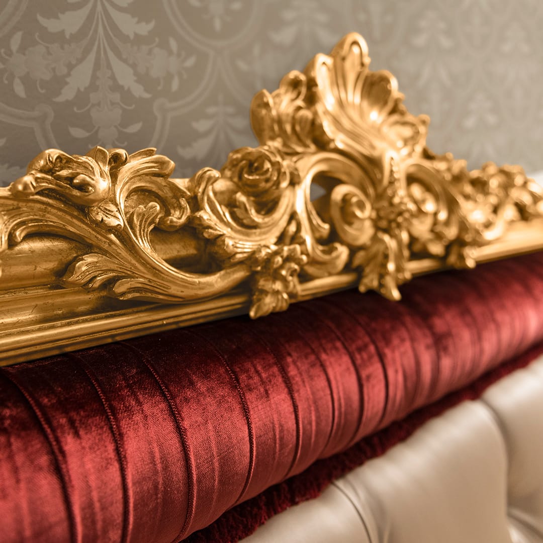 Mobilpiù Luxury's collections of classic-style furnishings include customizable pieces for both living area and bedroom. A variety of finishes and refined materials will provide exclusive solutions for every room: different types of wood, exquisite marbles, magnificent fabrics, and elegant finishing touches. The warm hues of walnut wood and the delicate veining of ash and fir complement the soft textures of velvet and silk, as well as the timeless allure of pleather in a variety of shades and finishes. The magnificent handcrafted decorations are accompanied by precious details in marble, metal, Swarovski crystal, and gold and silver leaf: a vast number of solutions to satisfy every requirement of taste.